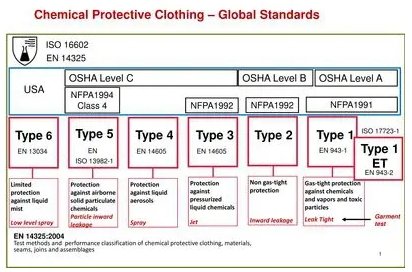 ส่วนการทดสอบชุด PPE จะถูกทดสอบในมาตรฐานที่ใช้กำหนดประเภท หรือ EN “ Type” ดังนี้: