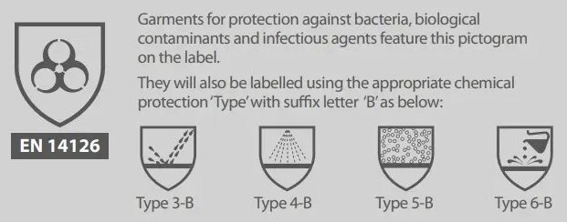 ด้วยเหตุนี้ ชุดPPE ที่ได้รับการรับรองมาตรฐาน EN 14126 ถึงแม้จะได้รับการทดสอบเพียง 1 ใน 4 จากการทดสอบ หรือได้รับการทดสอบทั้งหมด รูปสัญลักษณ์การรับรองบนฉลากก็จะเหมือนกัน