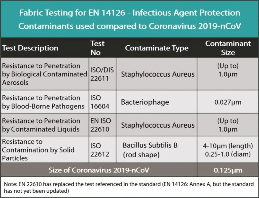 จะเห็นได้ชัดเจนว่าเฉพาะการทดสอบ ISO 16604 เท่านั้นที่ใช้สารปนเปื้อน – แบคทีเรีย ซึ่งมีขนาดเล็กกว่า ไวรัส COVID-19 ส่วนการทดสอบอื่น ๆ ใช้แบคทีเรียที่มีขนาดใหญ่กว่า Coronavirus มาก ดังนั้น ISO 16604 จึงเป็นเพียงการทดสอบเดียวที่แสดงให้เห็นความต้านทานต่อการซึมผ่านของเชื้อได้อย่างมีประสิทธิภาพ