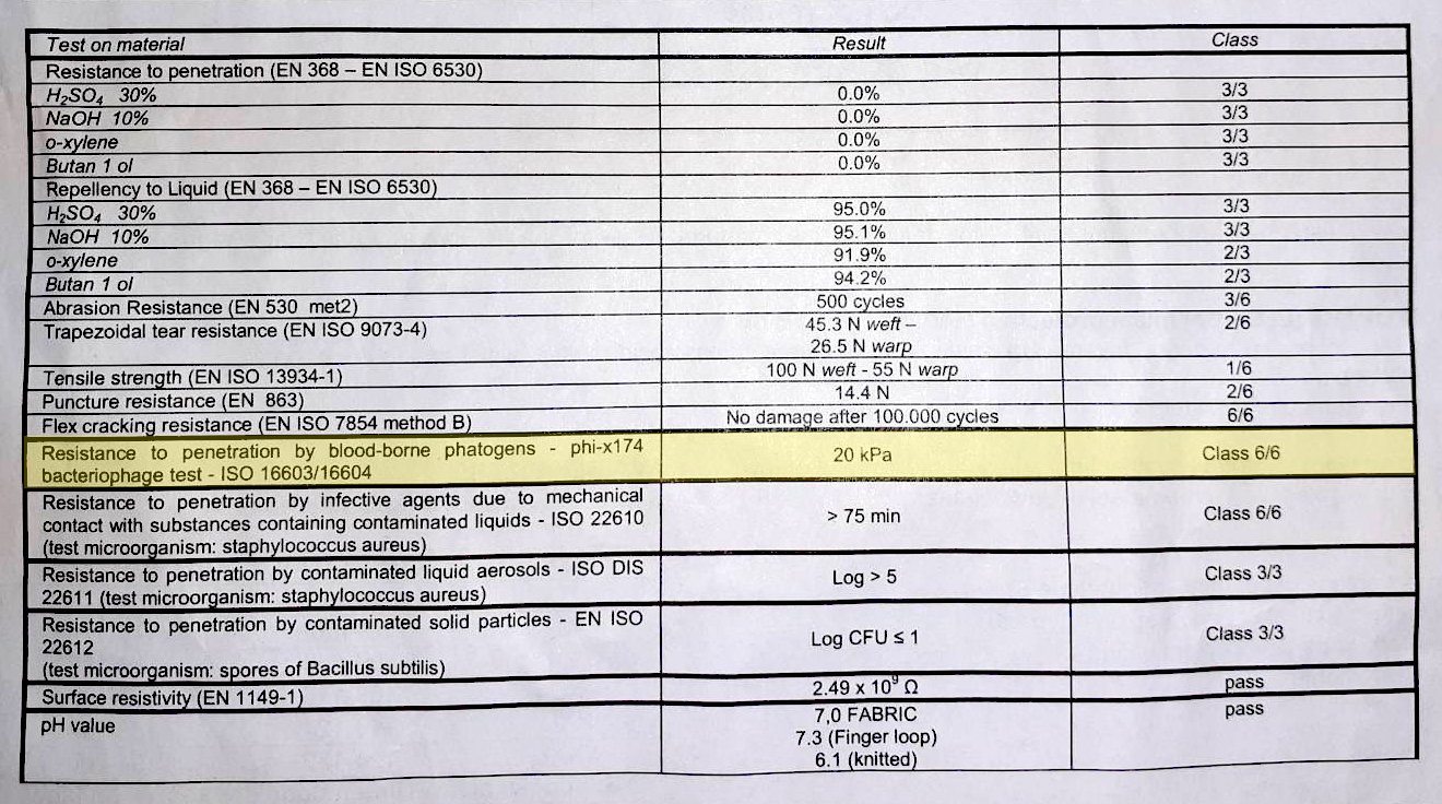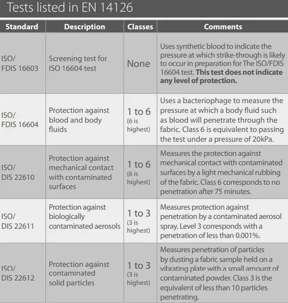 มาตรฐาน EN 14126 มีการทดสอบเพียง 4 อย่างเท่านั้นที่แสดงถึงระดับการป้องกัน โดย ISO 16603 เป็นการทดสอบที่ไม่ได้มีวัตถุประสงค์เพื่อบ่งชี้ระดับการป้องกันใด ๆ และ ISO 16603 ยังเป็นการทดสอบที่ด้อยกว่า 16604 อีกด้วย